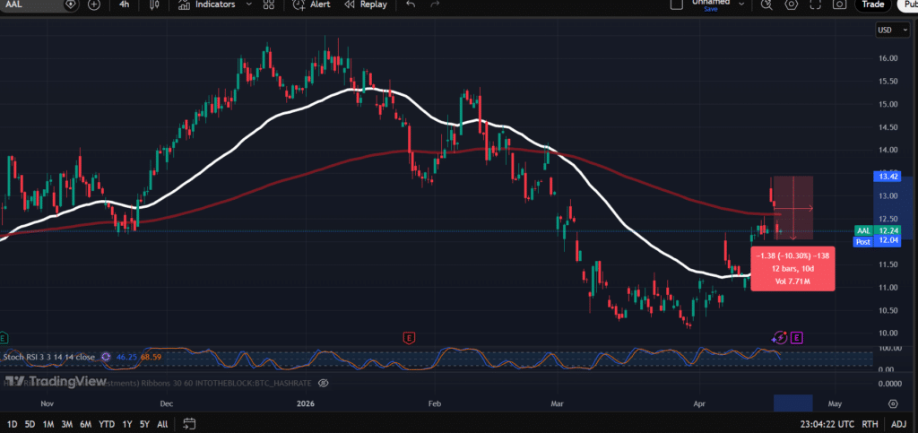 Ryto prekyboje „American Airlines“ akcijos krito daugiau nei 4 proc., taip panaikindamos penktadienį fiksuotą augimą, kai visoje rinkoje vyravo pakilimas.