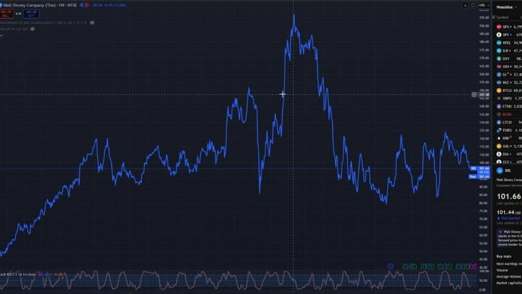 „Walt Disney” akcijų kaina priartėjo prie 100 JAV dolerių ribos ir pasiekė žemiausią lygį per daugiau nei 10 mėnesių. Tai pirmas kartas per daugiau nei 10 mėnesių. Tokia akcijų kainos dinamika atrodo keistai, turint omenyje, kad per šį laikotarpį bendrovė sulaukė daugiau gerų nei blogų naujienų, tačiau kritimas nėra visiškai nepagrįstas.