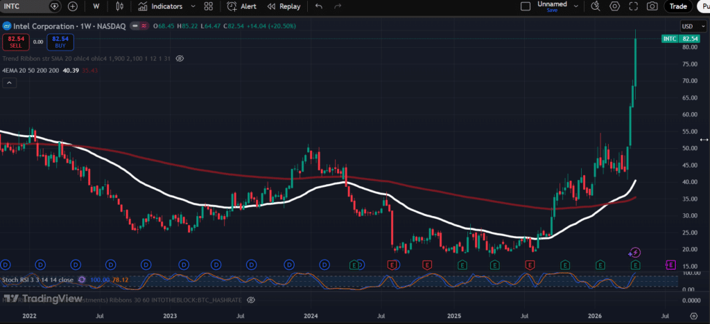 „Intel“ (INTC) akcijų savaitinis grafikas: kaina šoktelėjo iki 82,54 JAV dolerio, savaitės prieaugis – 20,5 proc. Šaltinis: TradingView.
