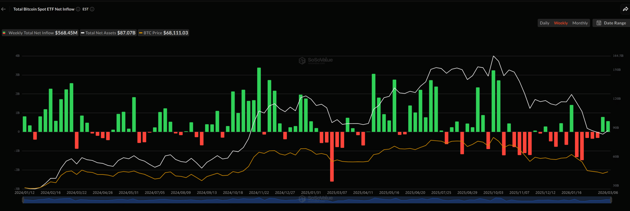Remiantis „SoSoValue” duomenimis, šią savaitę momentiniai bitkoino ETF pritraukė apie 568,45 mln. JAV dolerių grynųjų įplaukų. Praėjusią savaitę šis rodiklis siekė maždaug 787,31 mln. JAV dolerių, o tai liudija atsinaujinusį investuotojų susidomėjimą po kelių savaičių nuoseklaus lėšų nutekėjimo.