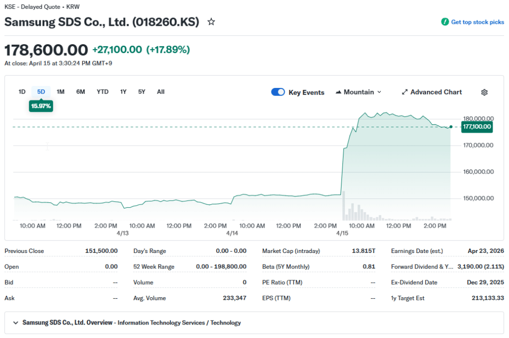 „Samsung SDS“ (018260.KS) akcijų grafikas, rodantis 17,89 proc. kainos šuolį iki 178.600 vonų po pranešimo apie privataus kapitalo milžinės „KKR“ investiciją.